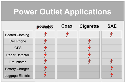 | Powerlet Panel Mount Kit - 24" Harness... Learn More | Powerlet Panel Mount Kit - 48" Harness... Learn More | Our SAE battery leads can handle 10 amps of current.   Other SAE battery leads u... Learn More | |||